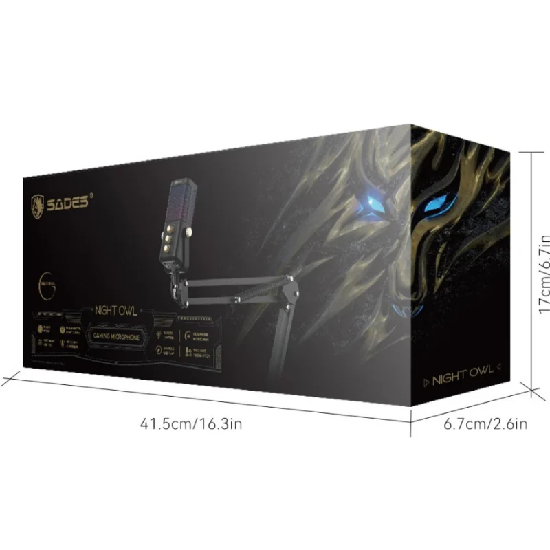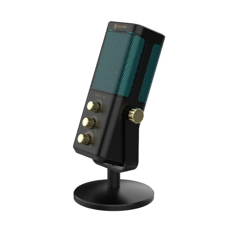 The Sades Night Owl SA-M01 is a USB gaming and streaming microphone designed for clear voice capture and easy control. It features a cardioid pickup pattern, built-in noise cancellation, RGB lighting, and dedicated knobs for voice blend and gain. Ideal for gamers, streamers, and content creators who need clean audio with simple setup.