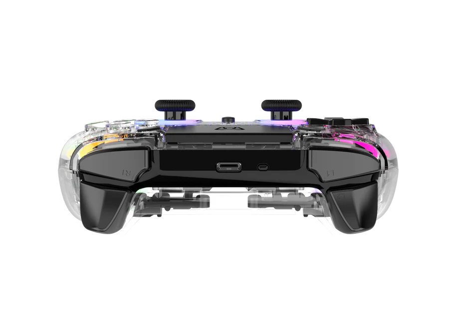 The transparent crystal design body with RGB light tubes surrounding both joysticks creates a mesmerizing visual effect — the internal components and glowing RGB rings are fully visible through the clear shell, making the P401 as much a desk showpiece as a high-performance controller. A 6-axis gyroscope enables motion controls for compatible games — adding an extra layer of immersion to racing, shooting, and action titles on PlayStation, Nintendo Switch, and PC. Programmable ML/MR back buttons bring a competitive edge by mapping any function to your fingertips without lifting your thumbs off the joysticks — a feature traditionally reserved for elite-tier controllers. The multi-touch touchpad3.5mm headphone jack with built-in speakeradvanced haptic feedback vibration, and turbo function round out a comprehensive feature set that rivals first-party controllers at a fraction of the price. The 600mAh polymer battery keeps you gaming on a single charge, recharging quickly via the included 2m Type-C cable.