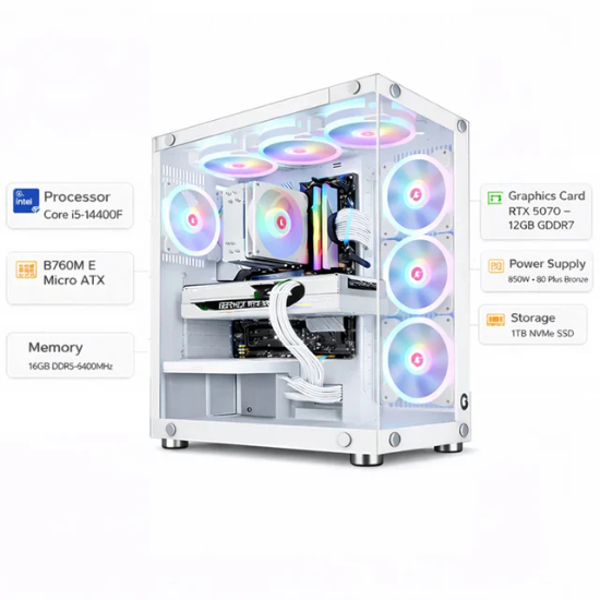 Gaming PC designed for smooth 1080p and 1440p gameplay with stable daily performance. Intel Core i5-12400F and INNO3D RTX 5070 12GB deliver strong graphics output for modern games and streaming. 16GB DDR5 6000MHz memory and WD Green SN3000 NVMe storage support fast system response and quick loading times. The GameOn Emperor Arctic II chassis includes seven fans for airflow, while the Aigo ICE200 Pro cooler helps maintain stable CPU temperatures.