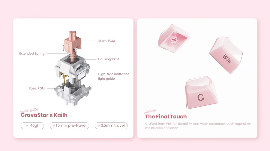- Switch Type: GravaStar x Kailh Cherry Pink Linear (40gf actuation, 3.5mm travel)