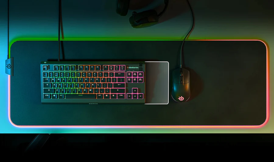 The SteelSeries Apex 3 TKL is a compact, tenkeyless keyboard built for gaming and daily use. With whisper-quiet switches rated for 20 million keypresses, IP32 water resistance, and customizable 8-zone RGB lighting, it delivers reliability and performance in a smaller form factor.
