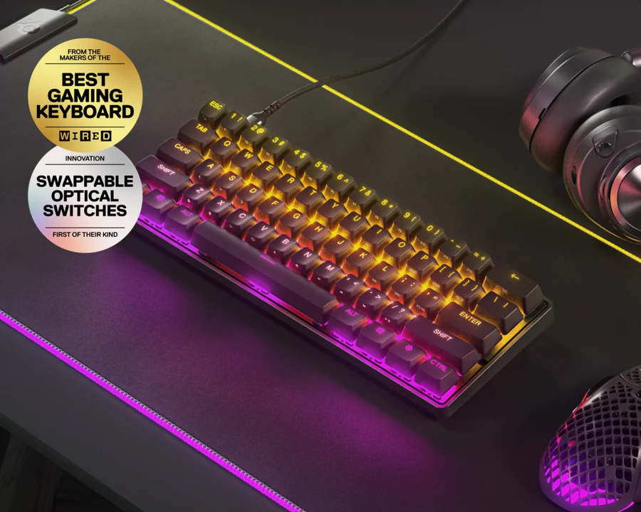 The SteelSeries Apex 9 Mini is a 60% compact mechanical gaming keyboard designed for esports performance and portability. Featuring custom OptiPoint optical switches, ultra-fast actuation, and a durable aluminum top plate, it delivers precision and speed in a small form factor.