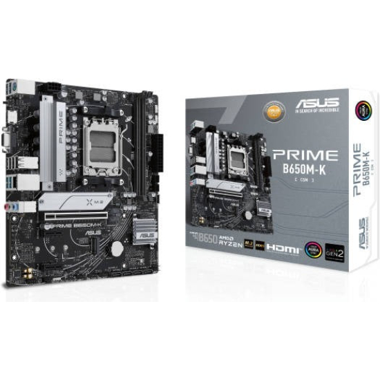 The ASUS PRIME B650M-K is a Micro-ATX motherboard designed for AMD Ryzen 7000 and 9000 series processors with the AM5 socket. It provides stable performance, DDR5 memory support, PCIe 4.0 connectivity, and multiple M.2 slots, making it a reliable choice for gaming and productivity in compact builds.
