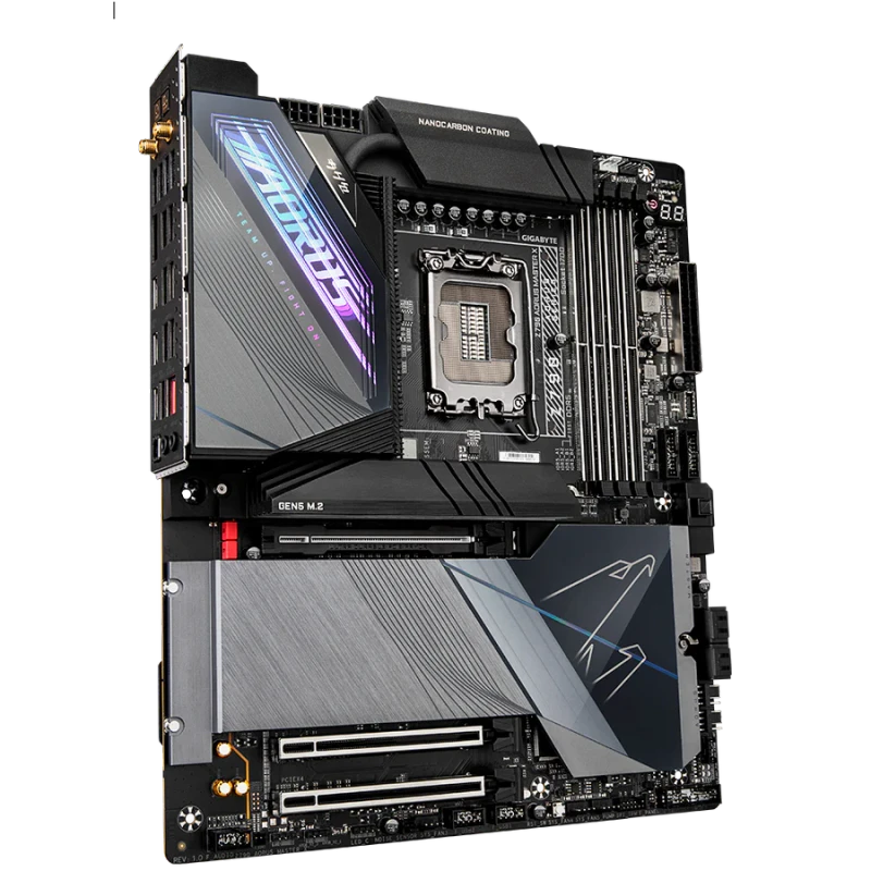 - 5× M.2 slots (1× PCIe 5.0, 4× PCIe 4.0) with tool-free EZ-Latch Plus