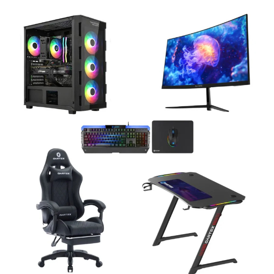 This full gaming setup includes a high-performance desktop, curved 200Hz monitor, RGB gaming combo, gaming desk, and gaming chair. The Intel Core i5-12400F processor and Asus Dual GeForce RTX 5060 OC 8GB Pcle 5.0 Gaming Graphics Card handle modern games with stable performance. DDR5 6400MHz memory and a 500GB NVMe SSD keep the system fast. The Twisted Mind Titan Glass case improves airflow and adds RGB styling. Windows 11 Pro comes pre-installed for instant use.