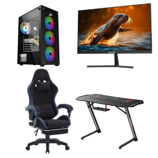 This bundle includes a gaming PC, 240Hz monitor, gaming chair, and RGB desk. It supports smooth gameplay, fast load times, and stable multitasking. The system is ready to use with Windows 11 Pro installed.