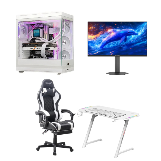 This setup includes a high-performance gaming PC, QHD 200Hz monitor, gaming chair, and RGB desk. It supports smooth gameplay at high frame rates with fast system response. The full white theme gives a clean and consistent setup.